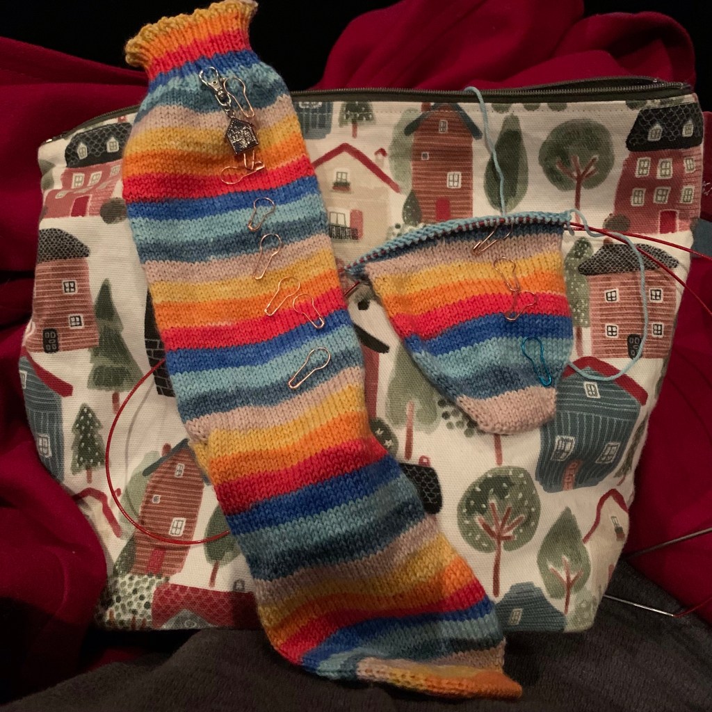I went to see the latest MCU film in the theater, Spider-Man: No Way Home. The only project for the movie theater is plain stockinette, so my DVD sock-in-progress was the clear choice. I snapped this picture right after I sat down. A couple of times during the movie, I felt a “hiccup” in the fabric; so, I would put the work down for a while and wait for a break in the action to try again. All told, I managed to get about twenty rounds knit before the end of the movie.