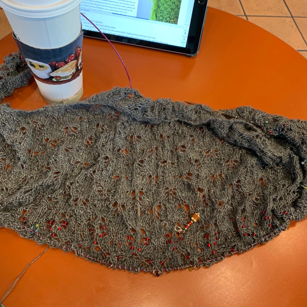 Definitely not movie knitting; I picked up this shawl after walking to the Starbucks cafe in the nearby Barnes and Noble store after leaving the theater. This lace and beads design is wonderfully intuitive. I don’t have to reference my pattern once I start a row. The rows are very long, though. It takes 30-45 minutes, depending on the complexity.