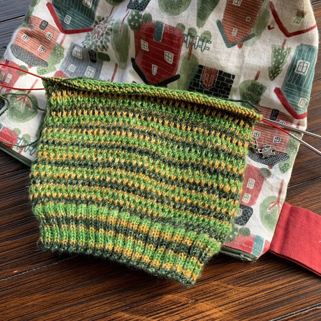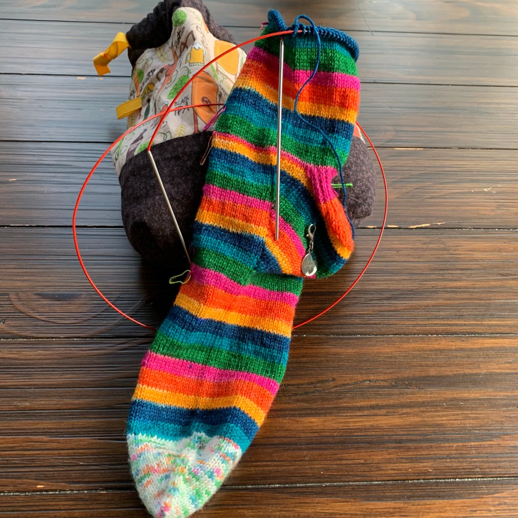 With the start of 2023, I jumped back into the year-long knit along (KAL) hosted by the dyer Desert Vista Dyeworks (DVD). This is the fourth year I’ve participated, though I work it every other year to manage the expense. DVD specializes in self-striping yarn, mostly sock weight, and the colorway choices are vast! With the club, one can earn two 30% discount codes and two free skeins of yarn for completing a pair of socks or mittens (now hats and fingerless mittens are available options, too) each month in the year. The key rule is that you must use a new skein each month, though one month in the year can be completed using leftovers. Contrast yarn can be used as well (e.g., cuffs, toes, heels), but must also be DVD yarns.