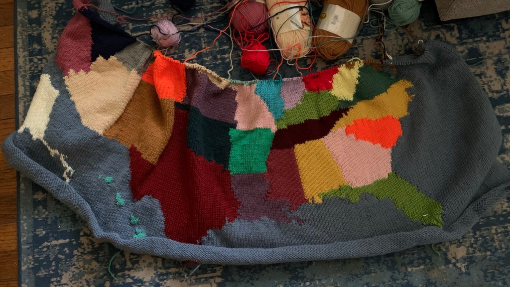 In that spirit, I’m currently working on an afghan that is a map of the United States. I’d had the pattern queued for over a decade. Being a perfectionist, I was hesitant to start without the “perfect” yarn collection. This year, I’m participating in a challenge to knit up more yarn than I bring in. This was the perfect impetus to get me crafting with the multitude of acrylic yarns in my stash, since I will never use them for 75% or more of my projects.