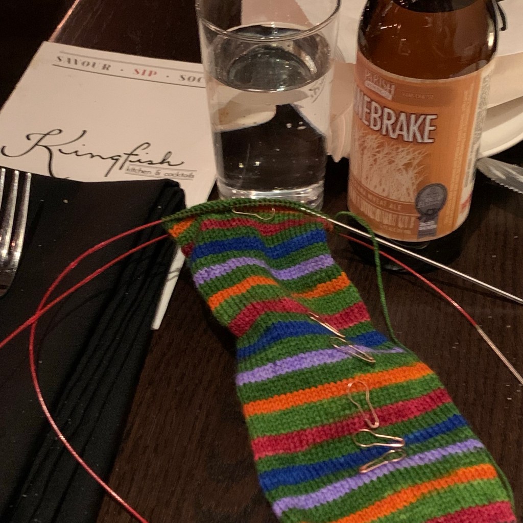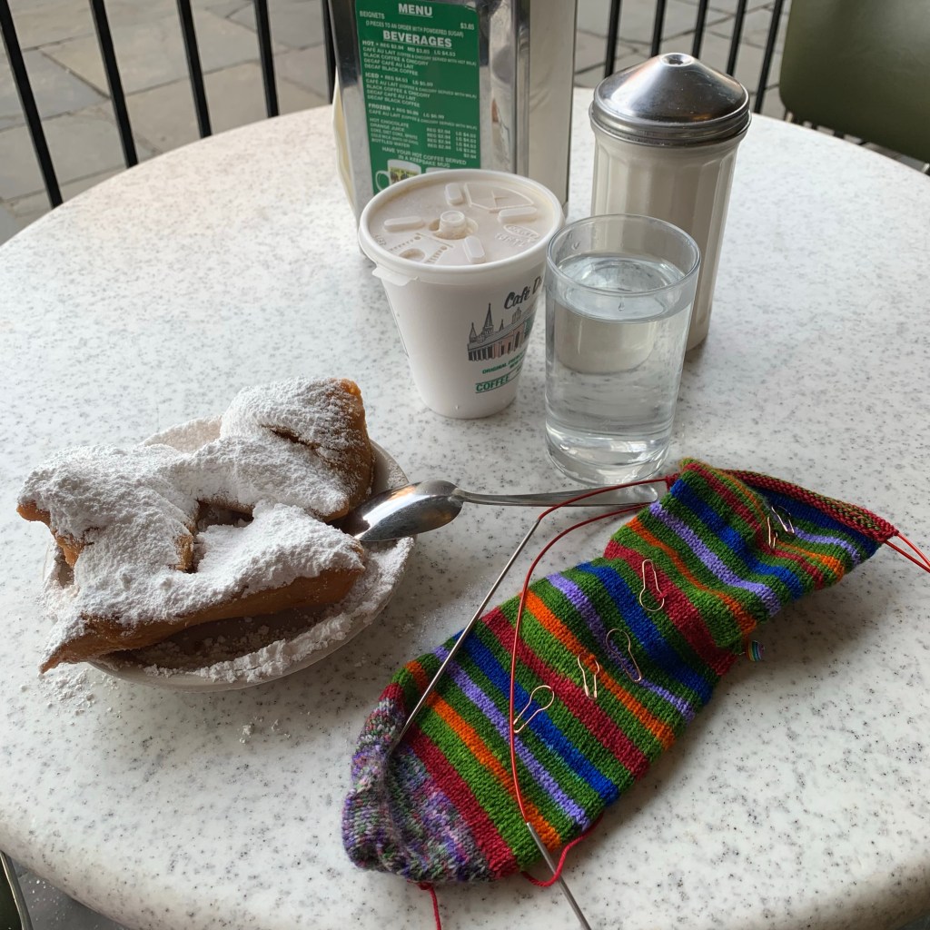 And during the week following the convention, I took a quick trip to The Big Easy for a toe-dipping introduction to the city. I’m now up to 41 U.S. states visited in my lifetime… making plans to visit a few more. While the trip was only for three days, I spent a good amount of time knitting. Flights and airport waiting provided a good chunk of that. A lot of my public knitting was done on my first sock of the December edition of the Desert Vista Dyeworks “sock club.” The night I arrived, I walked down the street for a yummy dinner…