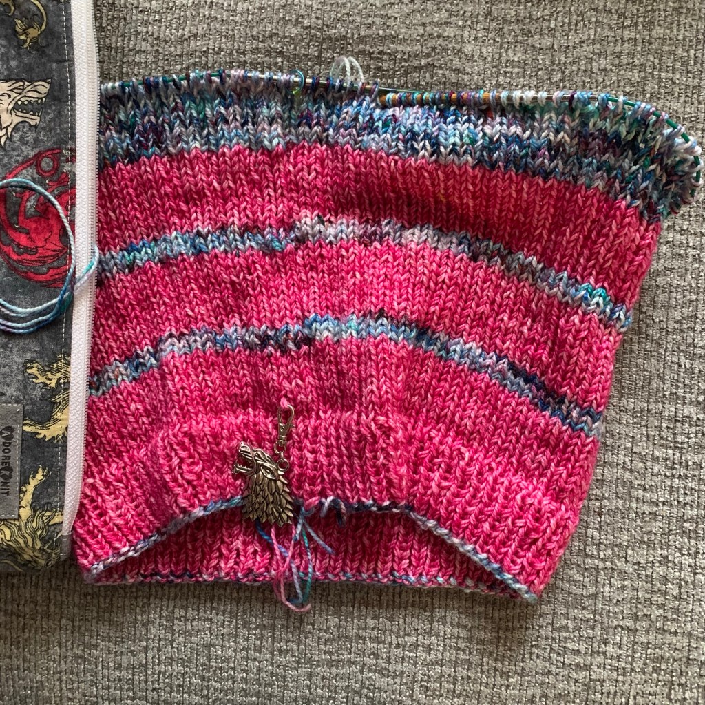 The other project I invested a good amount of time on during my trip was the Waymaker cowl, part of a knit along challenge in the Down Cellar Studio Pigskin Party. With the challenge, I need to finish the cowl by the end of the month. The design calls for DK weight yarn, but I don’t have two yarns I considered suitable. So I opted to hold fingering weight yarn doubled. And these two yarns are very special to me. They were part of a prize from a friend of mine who no longer dyes yarn. The variegated colorway was a custom design as I gave her the colors to combine. I think she did an amazing job! Because of the yardage requirements, I modified the stripe pattern, reversing the main and contrast colors when I reached the midpoint of the cowl.