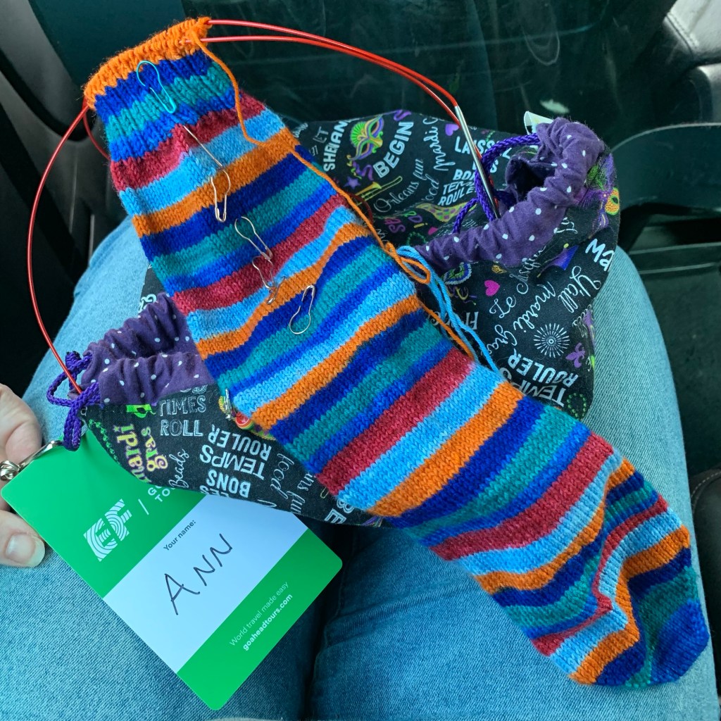 I’ll start with the socks. Though not pictured here, I finished the first sock today, en route to my hotel from the airport.