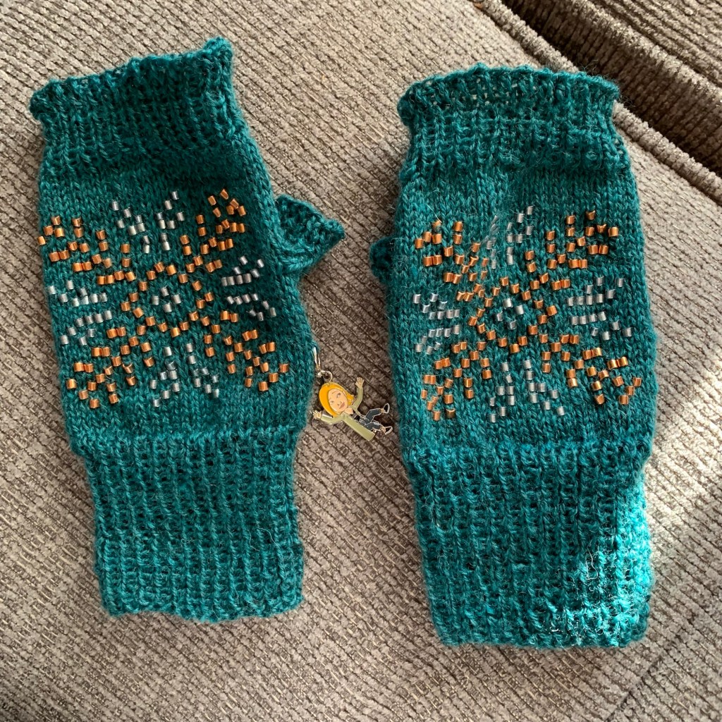 The mitts are done! I finished the second one on Monday. Although I’m usually a fan of loading up beads on a SuperFloss strand, the quality of the strands took a nosedive, and I found it was falling apart as I worked the first mitt. Plus, the bead sequence is specific and not really intuitive. So I placed the beads on the second mitt with a crochet hook.