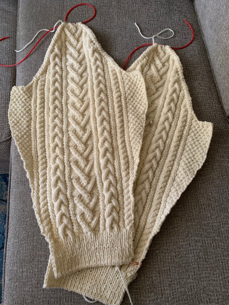 The Aran sweater is SO close to being finished! I wanted to seam it together today, but the sleeves are still damp from blocking them on Thursday night. One sleeve is particularly wet. I’m hoping to get this done tomorrow’s holiday. Then I just have to pick up stitches and knit the collar.