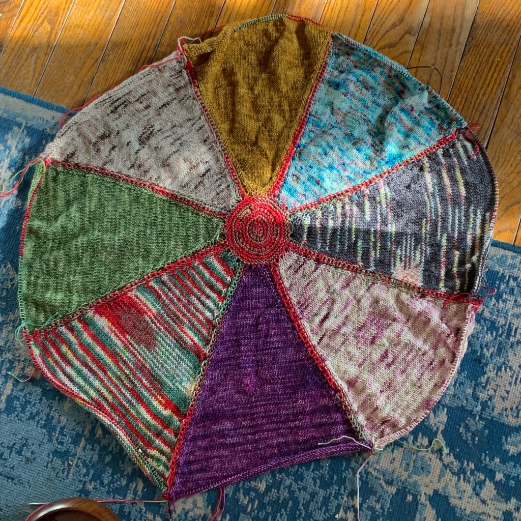 And last, but not least, is the Lolette shawl. The pattern and some of the supplies were a part of the Lolember series of gifts last year. The shawl is designed to be knit with an Advent yarn “calendar” made up of 24 or 25 mini skeins of yarn (20 grams each). I bought a set back in 2019 from an indie dyer friend who has since closed her shop and transitioned to making resin decorated cups/tumblers. I started the shawl in late January but got sidetracked with other projects and life. I dug out wedge 6, still in progress, and frogged it to start again. I knit the last three wedges this week, joined them all and worked the center. I have worked half of the setup on the outside of the circle, but unless I find another long cable, I won’t be able to photograph the piece flat after I complete this round.