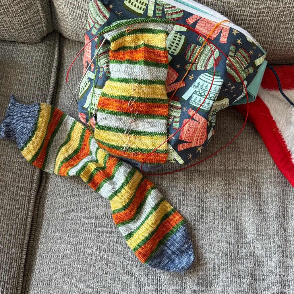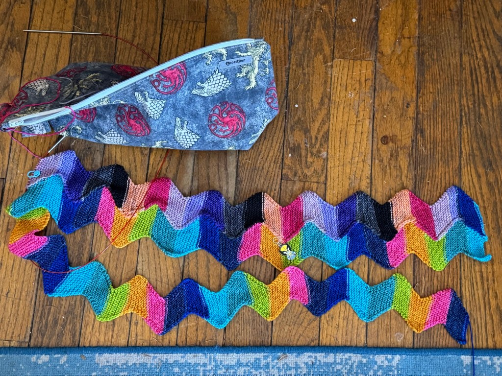 I started with the Brace Yourself colorway (November 2024 socks), and now I’ve introduced Pacific Sunset (April 2019 socks). I’m not thrilled with how the edge looks, binding off and casting on stitches, so it’s quite possible I will add a neutral border – probably crocheted – to hide it. And since the row joins swap sides concerning visibility, a contrast slip-stitch line could be added there as well. But I’ll wait until the rows are completed before deciding on that.