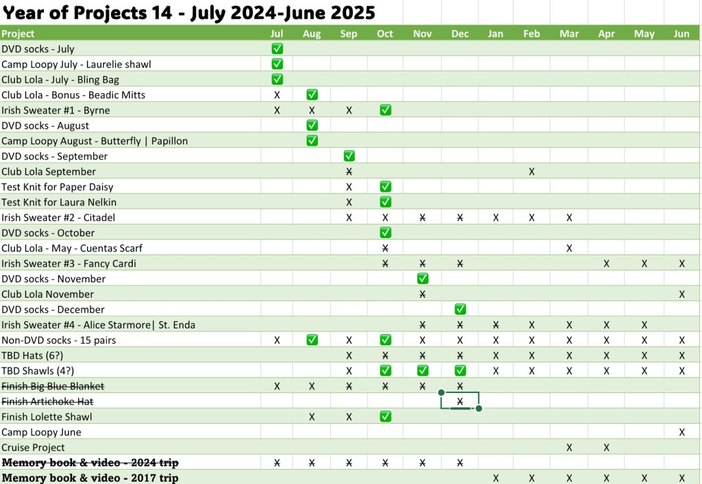 I removed three projects completely from the plan. Two (blanket and hat) just didn’t bring me joy, so they’ve been nixed. Oh, I realize now that I need to add the DVD Zig Zag blanket to the list because I already started it, lol. I don’t expect to finish it before July, but I do plan to put time into it each month until then; then it will carry over into YOP 15. And one of the memory projects has been moved out of YOP 14 since I haven’t really done anything on either. I’m resetting the goal to finish the 2017 project by the end of June, and perhaps the momentum will get me started on the 2024 project in July.