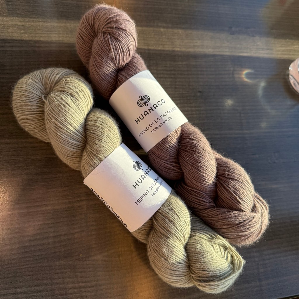 And as promised, I got a good photo of the cowl yarn selections from Huanaco Yarns – Merino de la Patagonia Single, fingering weight yarns in naturally dyed violet and gray.