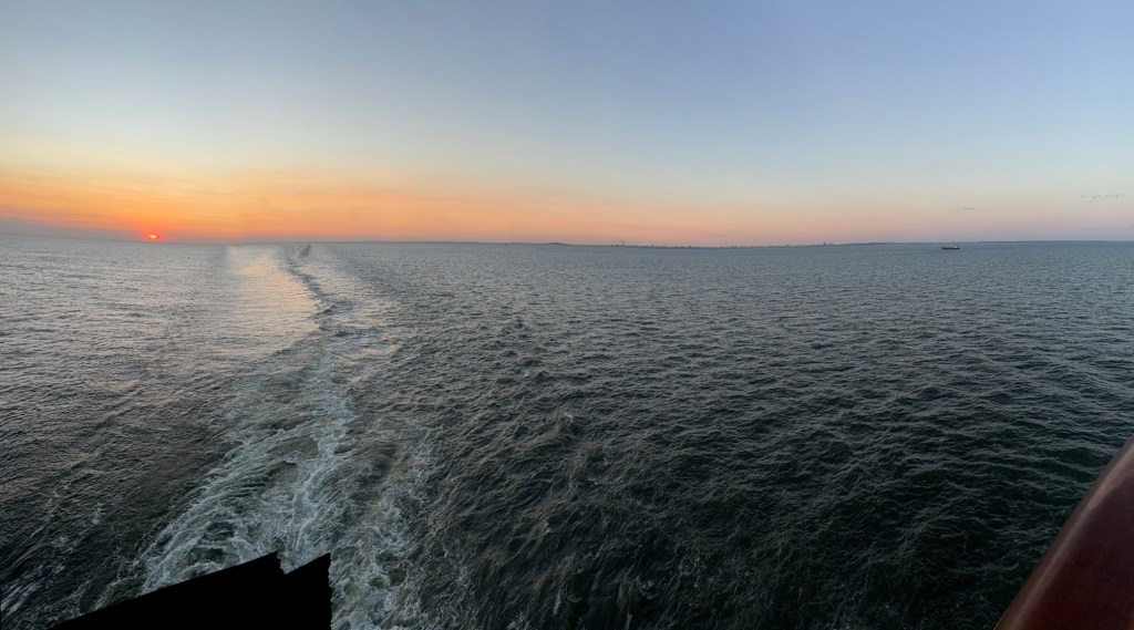 By this time, nearly 2pm, it was incredibly hot (90 degrees Fahrenheit) so I made my way back to the ship to take a nap and shower before dinner. We shoved off from the pier as I was eating dinner, and before long the sun was setting over the water.