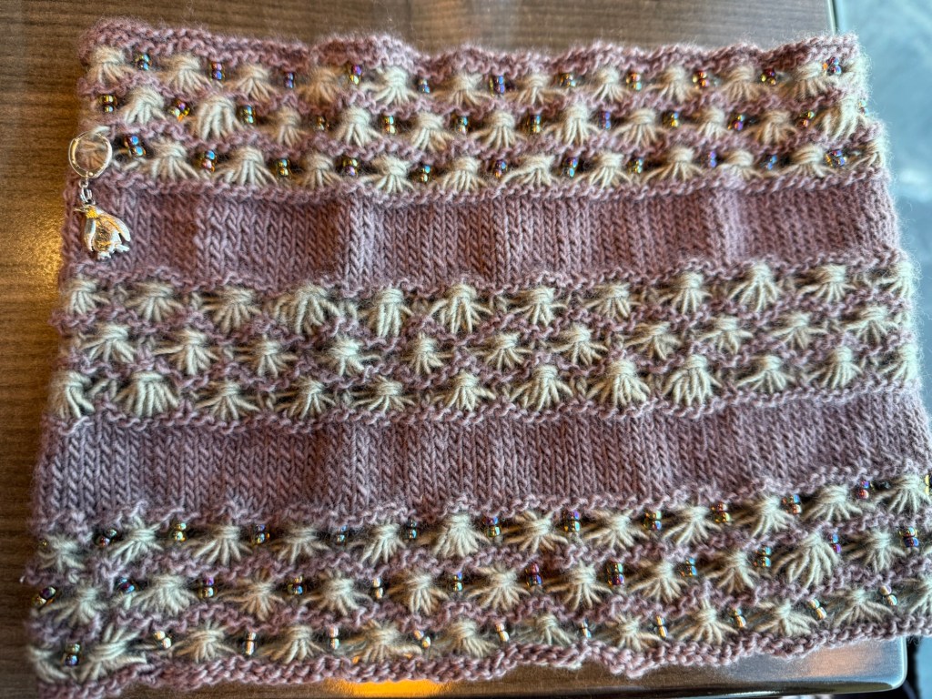 Pattern: Ceci Cowl by Laura Nelkin (exclusive to the cruise attendees – look for it in October); yarn: HUANACO Merino de la Patagonia Single in Noche en le Quebrada (violet) and Paso del Liquen (gray) on US 5 (3.75mm) and US4 (3.5mm) needles