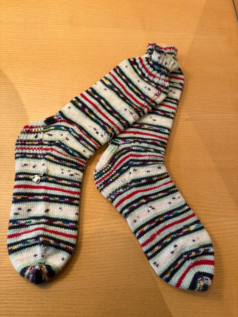 I finished the socks because I wanted the needles for another project (keep reading), and I love how they turned out. They’re fraternal twins, but so many people on the ship are super impressed.