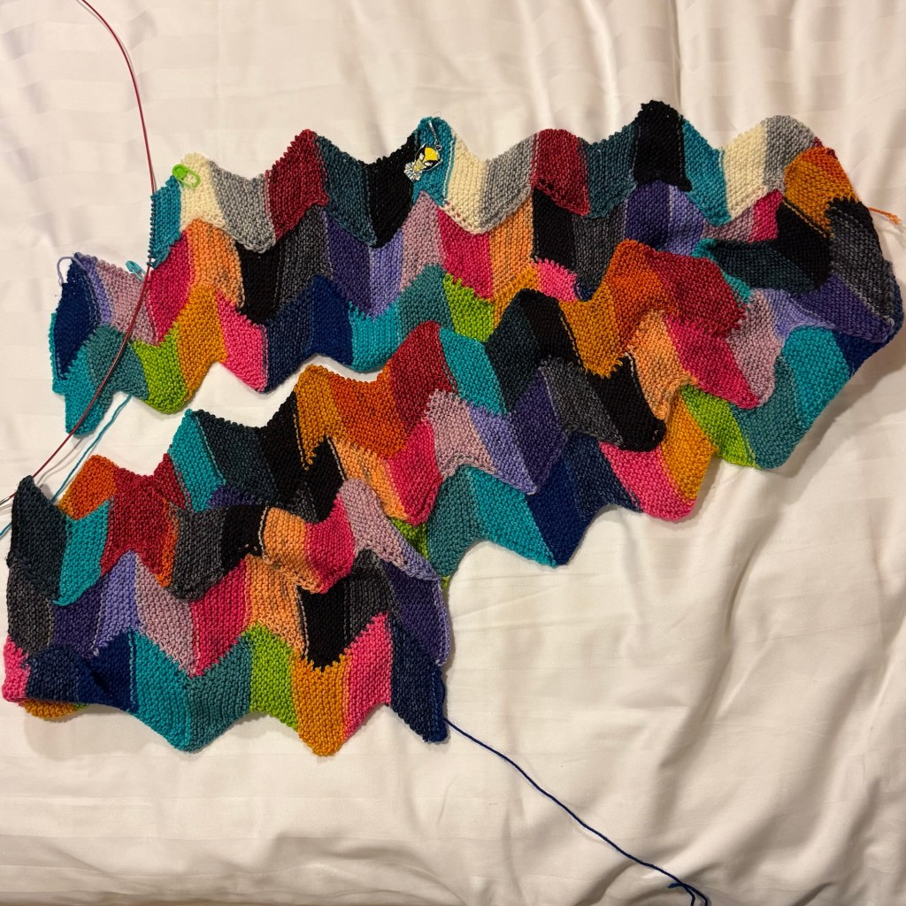 I grabbed this photo before dawn today since I knew I’d be working on it at least a little bit today. It turned out to really be a little – I haven’t finished the strip yet, but I think I have a half-zigzag remaining.