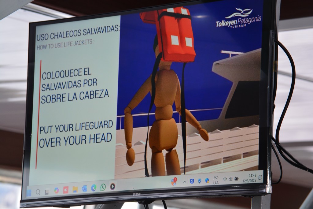 Wednesday – while the catamaran was making its way across the Beagle Channel to the islands we were to visit near Ushuaia, there was a safety video playing. I found this particular slide extremely amusing.