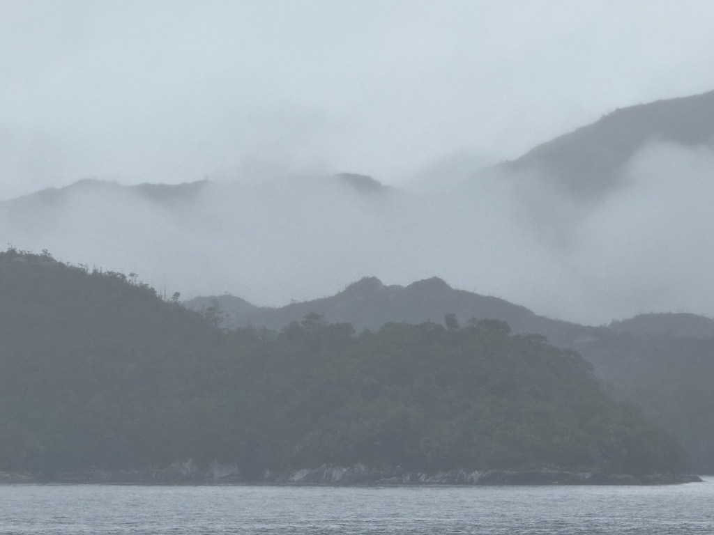 Of all the days for me to be out of sorts, this was probably the best one. The day was very rainy and foggy, plus we were just sailing in the Pacific Ocean until mid-afternoon. I made it back to my room to listen to some of the commentary, and a couple things sounded interesting. There were jellyfish out there and albatrosses. But it was raining and windy, so I was okay with staying inside most of the time. I did pop out as we were cruising through the Darwin Channel to snap some pictures, but it all looked the same…