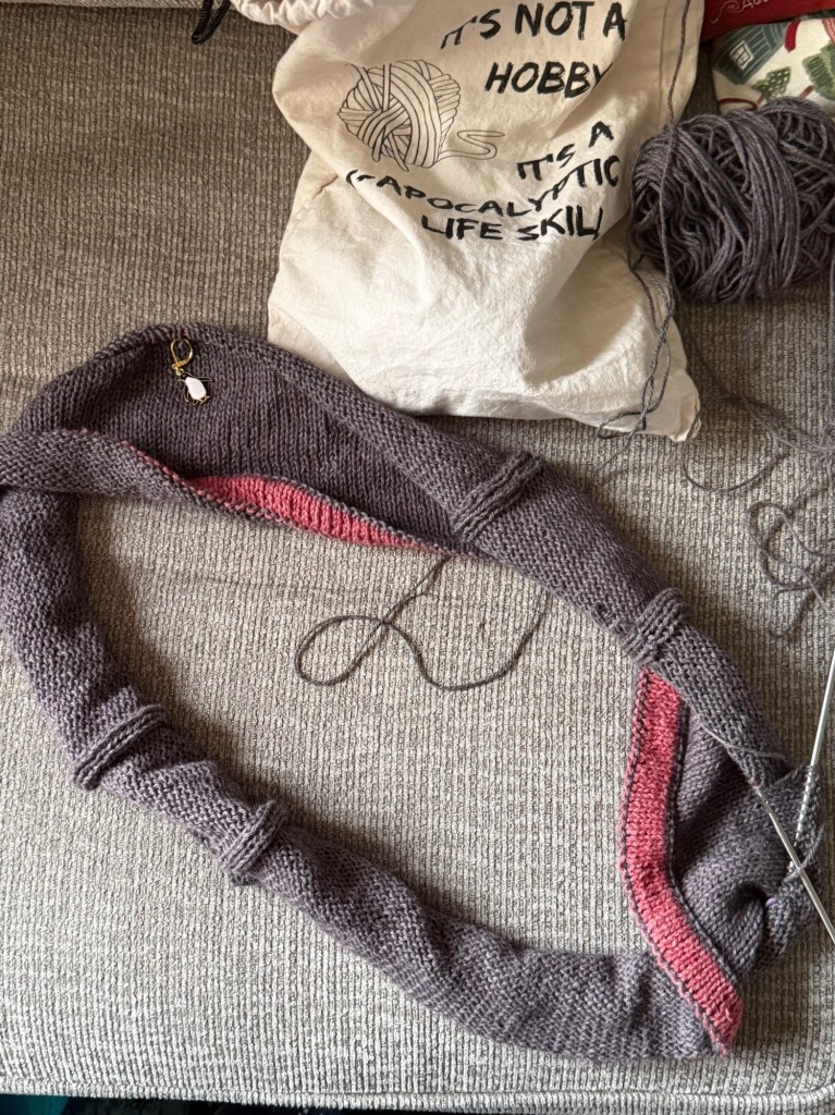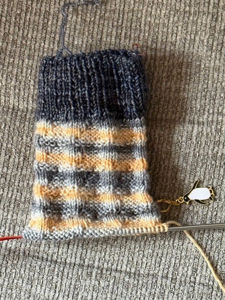 Since I spent so much time knitting that hat, I didn’t do much else. No blanket progress at all, or the orange cowl. But I did work on the tee – and I got a new penguin progress keeper from Etsy to replace the one from the cruise that I lost.