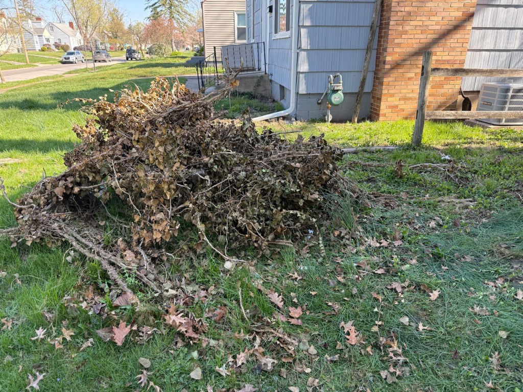 When we first talked about the work they would do, they mentioned renting a dumpster. Well, that didn’t happen. Instead, they just created a pile on my lawn. I didn’t even know about it until it was done and I happened to see this heaping pile of greenery on the lawn. Honestly, I’m not even sure when it happened… mid-February, maybe? But I didn’t have any capacity to address it then, and then I took off on my adventure. This past weekend I finally had the energy and drive to tackle the pile, especially since our yard waste pickup is happening on Tuesday (every other week).