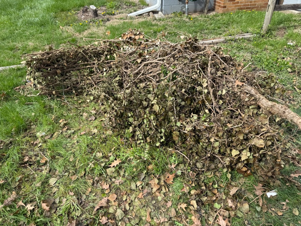 I’m working on collecting bids for the concrete work to replace my front stairs and handrail. And with the wood chipper I’ll grind down that ivy pile plus some other things that shouldn’t be growing in my flower beds (like some random trees???). I had to decline continuing the yard work contract I’d had with my neighbor for many years because he was doing the bare minimum (IMHO), just mowing and not managing any of the overgrowth. He did clear out some shrubbery that had been wasting away, among other things. But most of that stuff is gone. I know I can handle mowing, and then I’ll try my hand at addressing the other landscaping features.