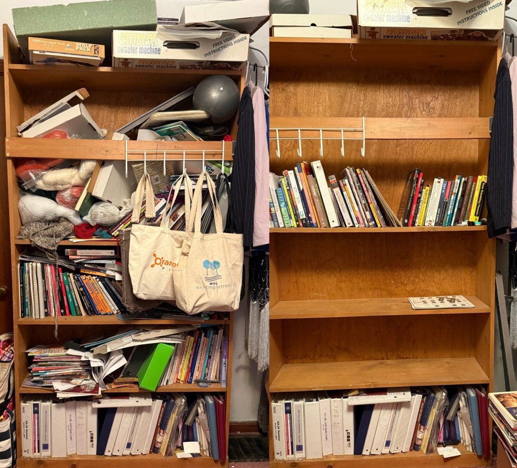 After putting in so many hours clearing the floor space in my office, I turned my attention upward. One of the decluttering groups I’m a member of (Kindred Spirits, hosted by Dana K. White of A Slob Comes Clean) hosted an hour of body doubling one evening. I took that hour to work on decluttering the big bookcase in my office. This was the headboard shelving unit for my son’s loft bed, and I’m eager to get it out of the house. Its partner is upstairs and will be removed later this summer. First, I had to sift through all the books and other miscellaneous items that have lived here for years. In that one hour I made it through three complete shelves, choosing to keep less than one shelf-worth of items. They’ll soon be relocated to my bedroom. And on Friday I managed to empty the fourth shelf – nearly everything has been distributed between trash/recycling and donations, so all getting out of my house!