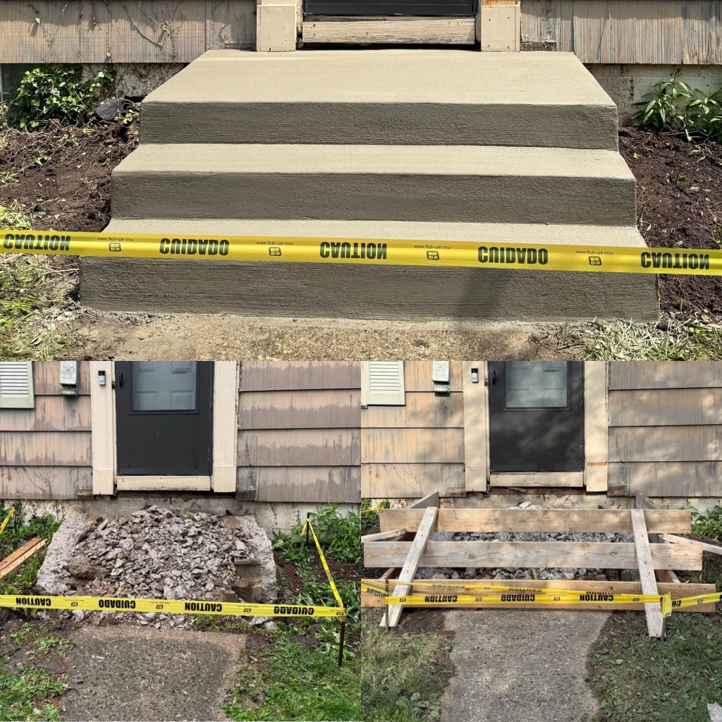 I also mentioned last week that my new front porch was in queue to be put in place! Thanks to the rainy weather at the beginning of the week, the scheduled changed slightly. But on Tuesday, they began to demolish the old concrete pad. On Wednesday, they put the framing in place so that on Thursday the gravel and then concrete were poured in. On Saturday I celebrated the removal of the caution tape by setting up my new mailbox! I was very anxious to get that done, so it’s not set in concrete. I’ll keep tabs on it – the post is buried about 18 inches into the ground.