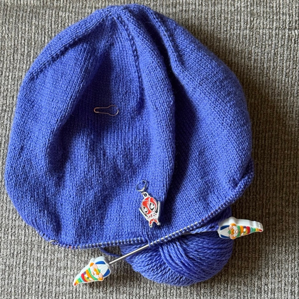 I’m about a quarter-inch away from starting the ribbing for the middle section of this hat. I had been considering switching up colors to work blocks so that the ribbed brim is one color and each end of the hat is a different color. But I’m also thinking about finishing up with this yarn. I’ll decide once I get there.