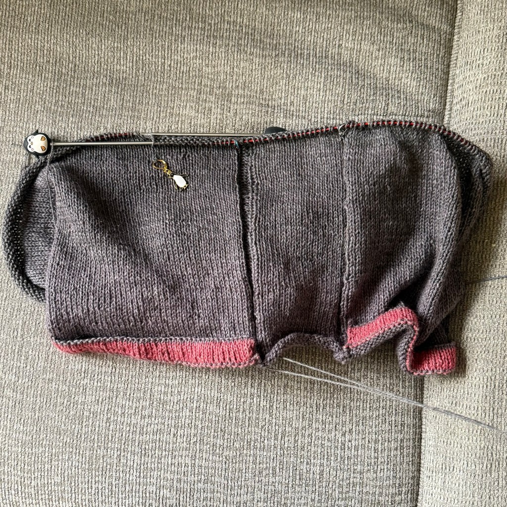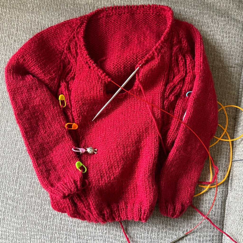 This toddler sweater is likely going to be my next true finished object. Last week I had nubby sleeves (see the yarn & needles stitch marker on the left), and once I put the effort in, it didn’t take long to finish the sleeves, join them to work the yoke, and then decrease stitches as I went. The collar is almost done now, and then a button band will be added. This should be done by the end of the week!