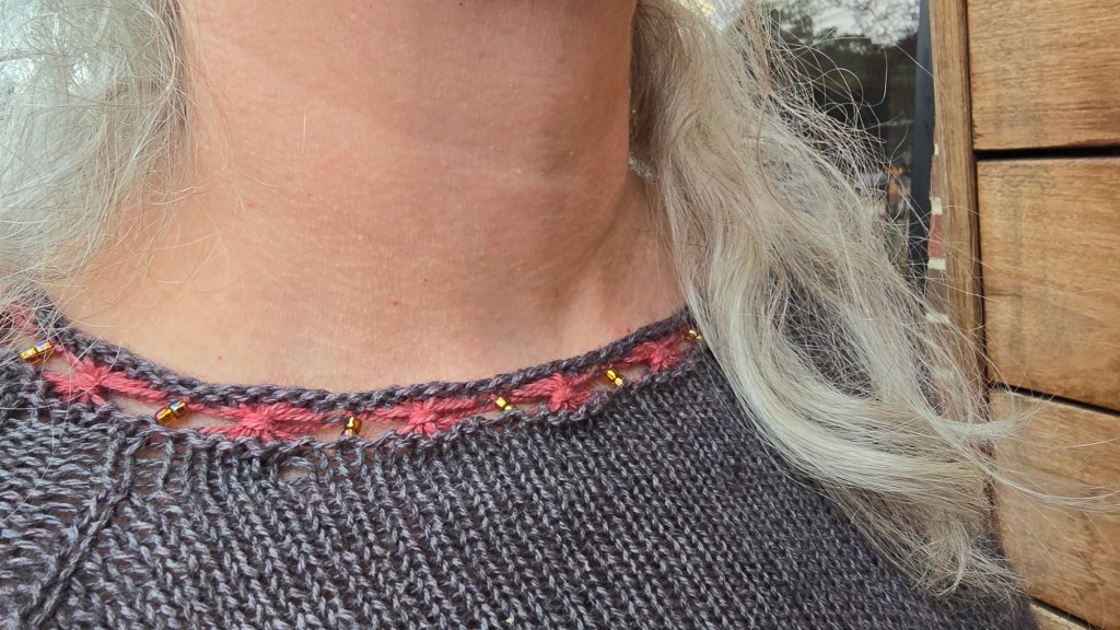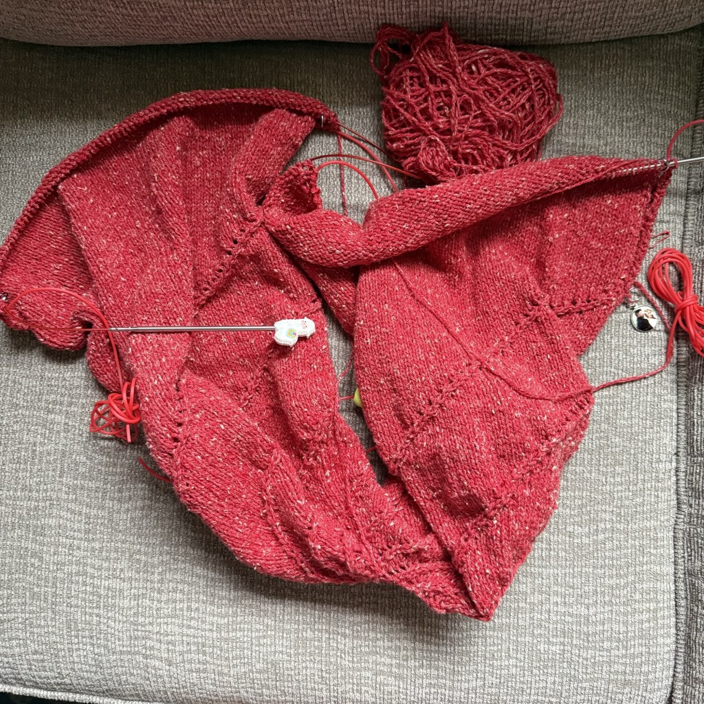 The Lake Hug project is continuing to grow as well. I finished the stitch pattern on the second wing so it’s a simple stockinette plus edge stitches for each wing. I’m working them 2AAT, and the skein on the second wing is nearly depleted. I’ve got a ways to go before starting the sleeves; now that the designer has released a video showing how to wear this piece , I understand why the wings need to be so long!