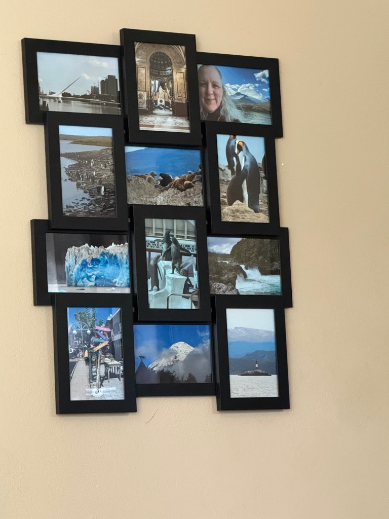 I haven’t had a great deal of time to make progress on the decluttering front, but I did complete a little project on the decor front. I put together the photo collage from my South America cruise last Monday. I’d printed the pictures before Memorial Day weekend, but the family drama stalled my efforts to work on this. I had printed fifteen of my favorite photos, and I could only put twelve of them in the collage, six portrait and six landscape. One nice things about these collages is that I can swap out photos if I choose to. I have two other travel-related collages on this wall, and I’m contemplating changing things up. Stay tuned.