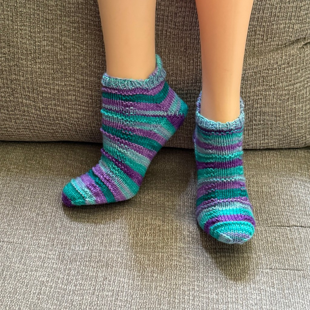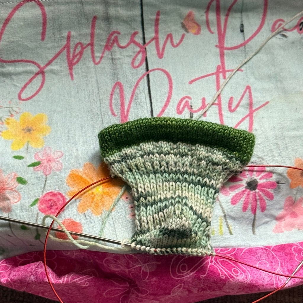 Once I finished those quick shortie socks, I discovered another shortie pattern that was released on June 1 by another sponsor of the Splash Pad Party. Given how much I enjoy have socks on the needles, and wanting a brief respite from the Supersock World Championship qualifier pair I have in progress, I cast on. For this edition, I went to my stash and found a sponsor yarn mini and wound up a skein of yarn I purchased earlier this year. With the Net Loss challenge in the Knitters Brewing Company group on Ravelry, I’d like to use as much of the yarn I take in this year as possible – and continue using up my stash! I’d really like to craft up more than I take in by the end of the year! Shorties won’t get me there quickly, but it’s at least a dent in the total.