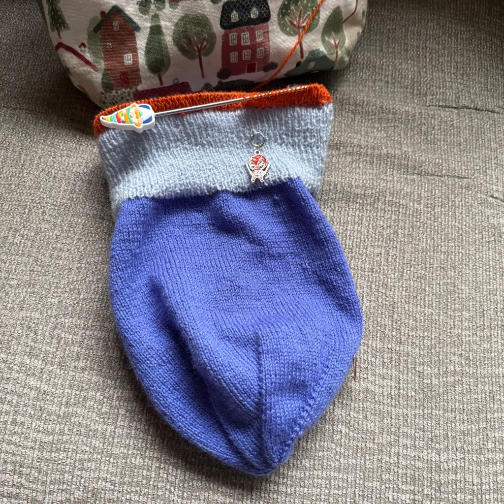 I’m starting off with a project that wasn’t even on my radar when I posted last Monday! I cast on this pair of shortie socks on Monday afternoon, and I finished them on Friday! They are shorties, and knit in DK weight yarn, so it really wasn’t a stretch to manage that. I also reached out to the designer to get clarification on the pattern instructions for the toe decreases. These fit me perfectly (but photograph better on the mannequin feet!) – and I received many compliments during the week as I shared my progress on Ravelry. The yarn is from a Suicide Awareness fundraiser the dyer held, and the pattern is from a previous year’s Pigskin Party. Both elements earn me points in the Splash Pad Party (both parties hosted by Down Cellar Studio) along with the amount of yarn used and the stitch markers I needed when working the heel and gusset.