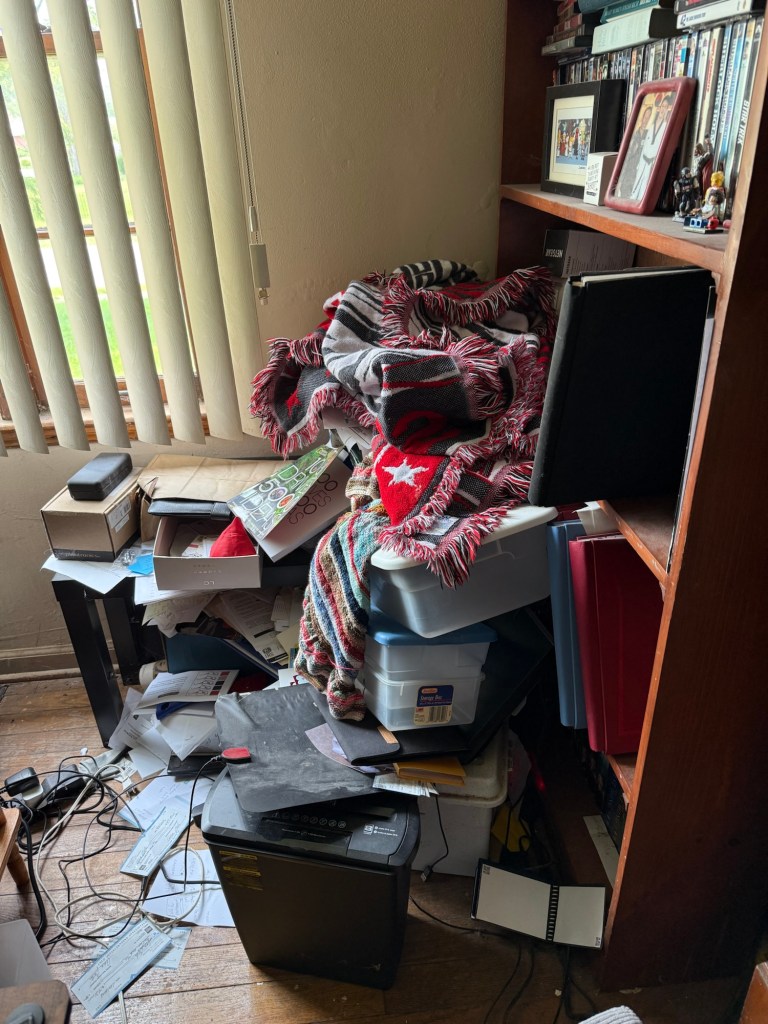 Anyway, the live session was presented around midday, so I set aside my lunch hour for decluttering. Before and during her YouTube livestream, I focused on a corner of my living room. I’ve been wanting to tackle this mess for quite a while, but it hasn’t been a priority for me. Dana’s no-mess five-step approach makes it very easy to make progress. And I got a lot done in the hour I had to devote to this spot.