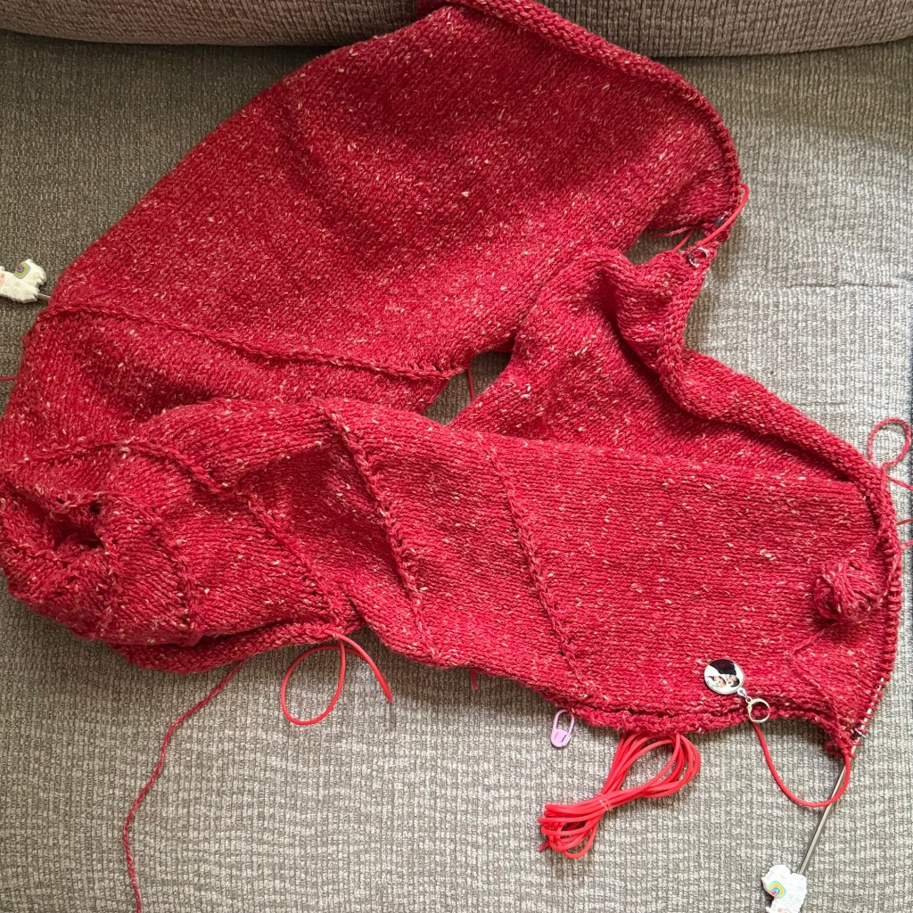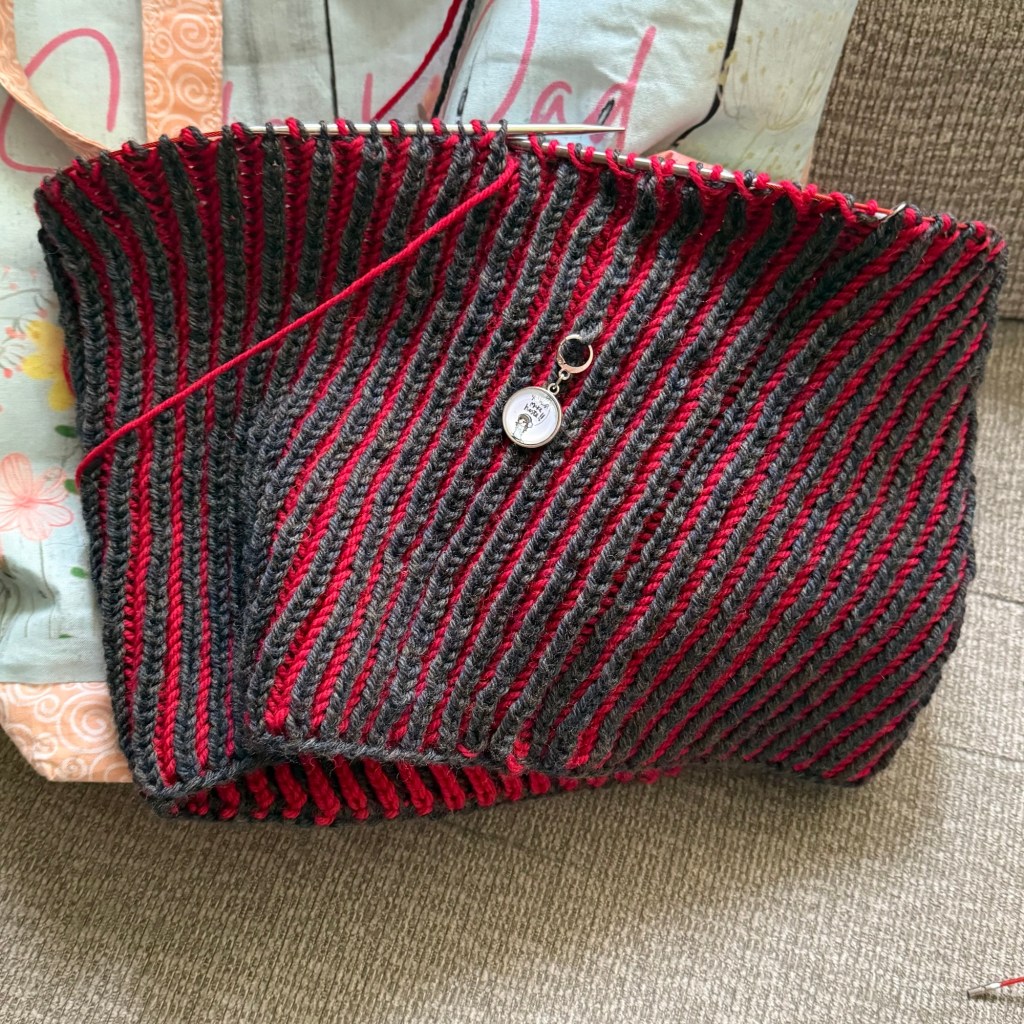 Nothing finished this week, but I made some decent progress on most of my WIPs. I did not work on the sock I’d cast on the week prior, but that’s being added to my plans for this week. Meanwhile, the brioche cowl is continuing to grow. I’m still loving the contrast of the bright red and dark heather gray – and I confirmed that I can add black yarn for my bind-off. Because this project is my June edition of Camp Loopy, the make-a-long rules impact my choices. I’m allowed to add in additional yarn (purchased from The Loopy Ewe before the Camp ordering start date) as long as the qualifying yarn meets or exceeds the yardage minimum (400 yards for this project). If I completed this cowl per the pattern, I’d bind off in red. But I want to maximize the yardage for both the red and gray yarns, plus I think the red would be jarring as the bind off color.