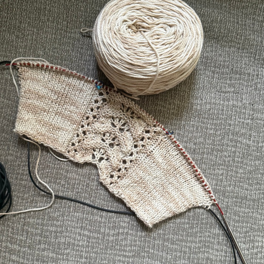 Then, the yarn I ordered last week following the Novus Sweater Workshop with Laura Nelkin arrived! I picked it up on Saturday and wound up the first skein right away. I started off knitting a stockinette block, and then I read Laura’s guidance blog on gauge swatching for the Novus collection. She recommends starting the sleeve and blocking that piece. If the row gauge is working as expected, I can simply continue the sleeve. I’ve ordered some Wonder Clips, slated to arrive later today, so I’m hoping I can confirm gauge before I head to Minnesota!