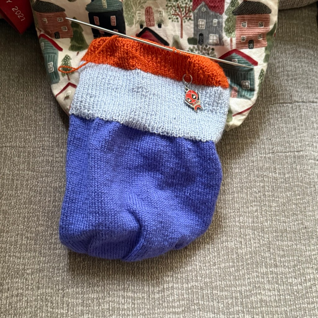 The simple color block hat is also continuing along nicely. I’ve taken it to the movies a couple times this week, but I’ve found the ribbing is a little tricky in this yarn at this gauge. My ribbing got messed up at one point, and I also dropped a stitch at one point. It’s easy to recover in good lighting, so it’s not earth shattering. But until I get back to the stockinette section, I’m not going to attempt knitting the ribbing in the dark. It’s quite possible that I’ll get to that section this week! Oh, and I also worked on this project during Worldwide Knit In Public Day on Saturday, though I didn’t take any pictures as I had a lot going on. Sadly my gnome needle stoppers are currently MIA…