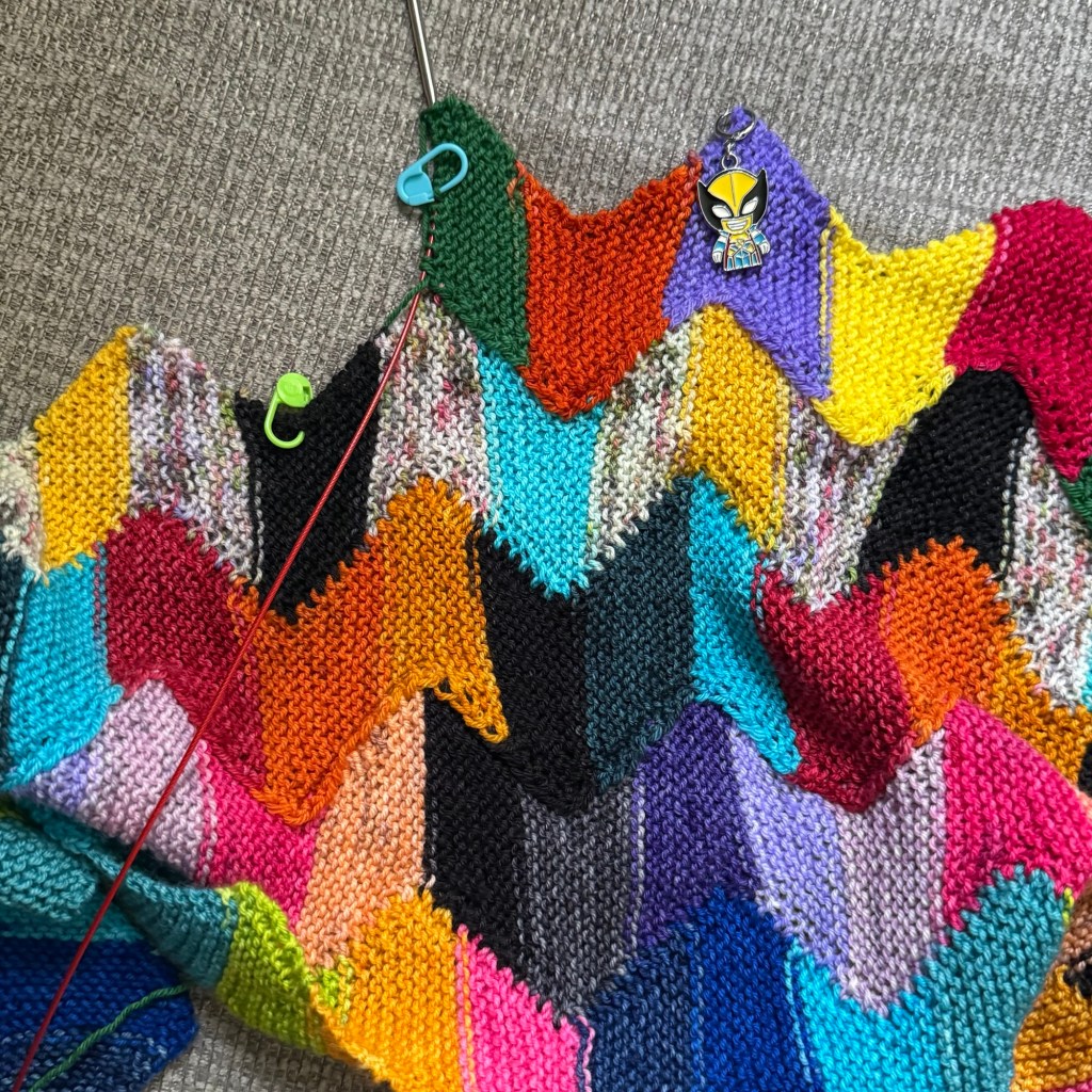 I did cast on a couple projects this week, part of the reason I didn’t get as far on the WIPs. Both are starting off beautifully, too! To begin, I had pulled out the two skeins I bought in Myrtle Beach back in January. I don’t know that I’ll finish it this month, but the rainbow array of colors in the bright yarn gives it a Pride aesthetic. This is a nice design that allows me to work as far as the yarn allows.
