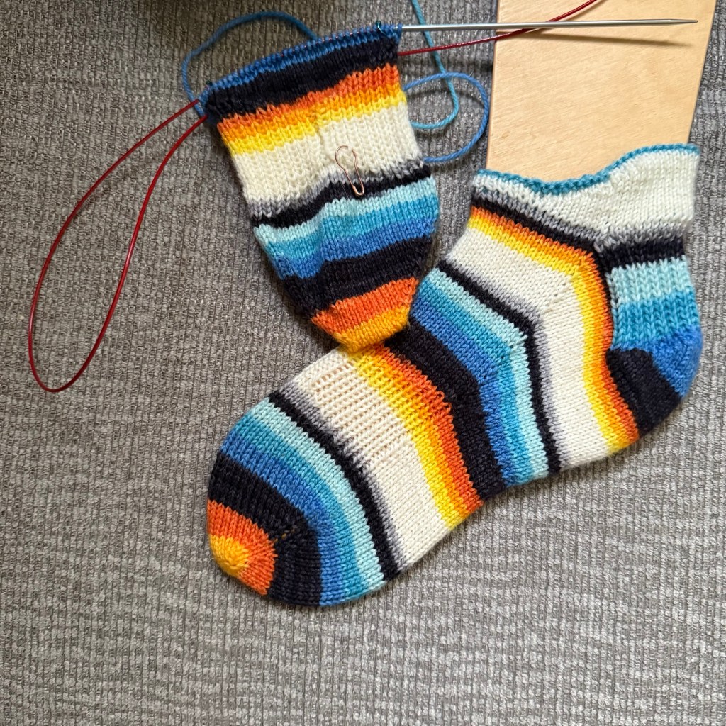 Last week, Laura Nelkin released the toe-up version of her Larch Peds pattern, cute shortie socks. I knit up a pair of the original cuff-down pattern last year, but I do prefer to knit socks toe-up for a few reasons. I didn’t waste any time winding up one of the self-striping yarns I bought at ZK and casting on! I finished the first one in less than three days, and I’m doing my best to get the second sock to match (to some extent) the first one. The fact that I was able to complete the entire heel tab in solid white before the next color transition was extraordinary, as it makes a great contrast to the contrast mini! Right now it’s looking like the color changes are happening several stitches sooner on the mate, but I’ve got a ways to go before I can know for sure.