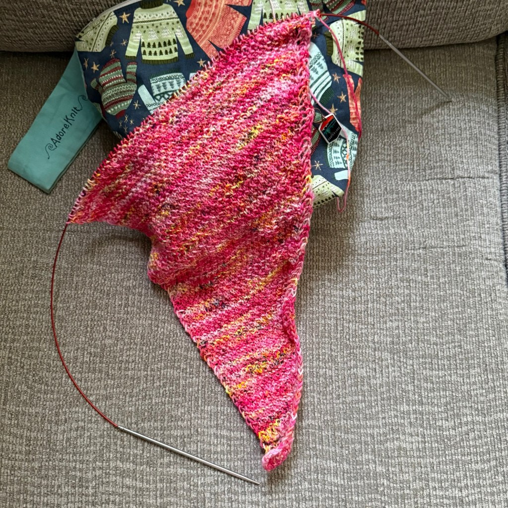 I made some progress on the shawl I started at ZK – again, it’s fairly easy to work since the pattern is very basic. I put some time into it on Wednesday while waiting for some car maintenance work to be completed. And I picked it back up yesterday for a bit, though I had to focus at first. I’d been working so much on the drop-stitch pattern, I almost started working the wrong pattern.