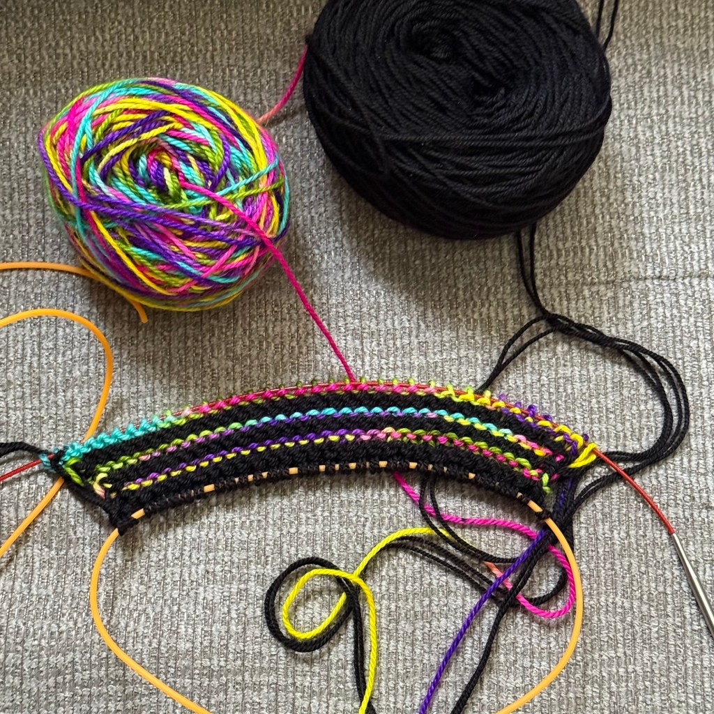 madelinetosh Twist Light in Onyx and madelinetosh Pashmina in Piñata Pop, on US6 (4.0mm) needles