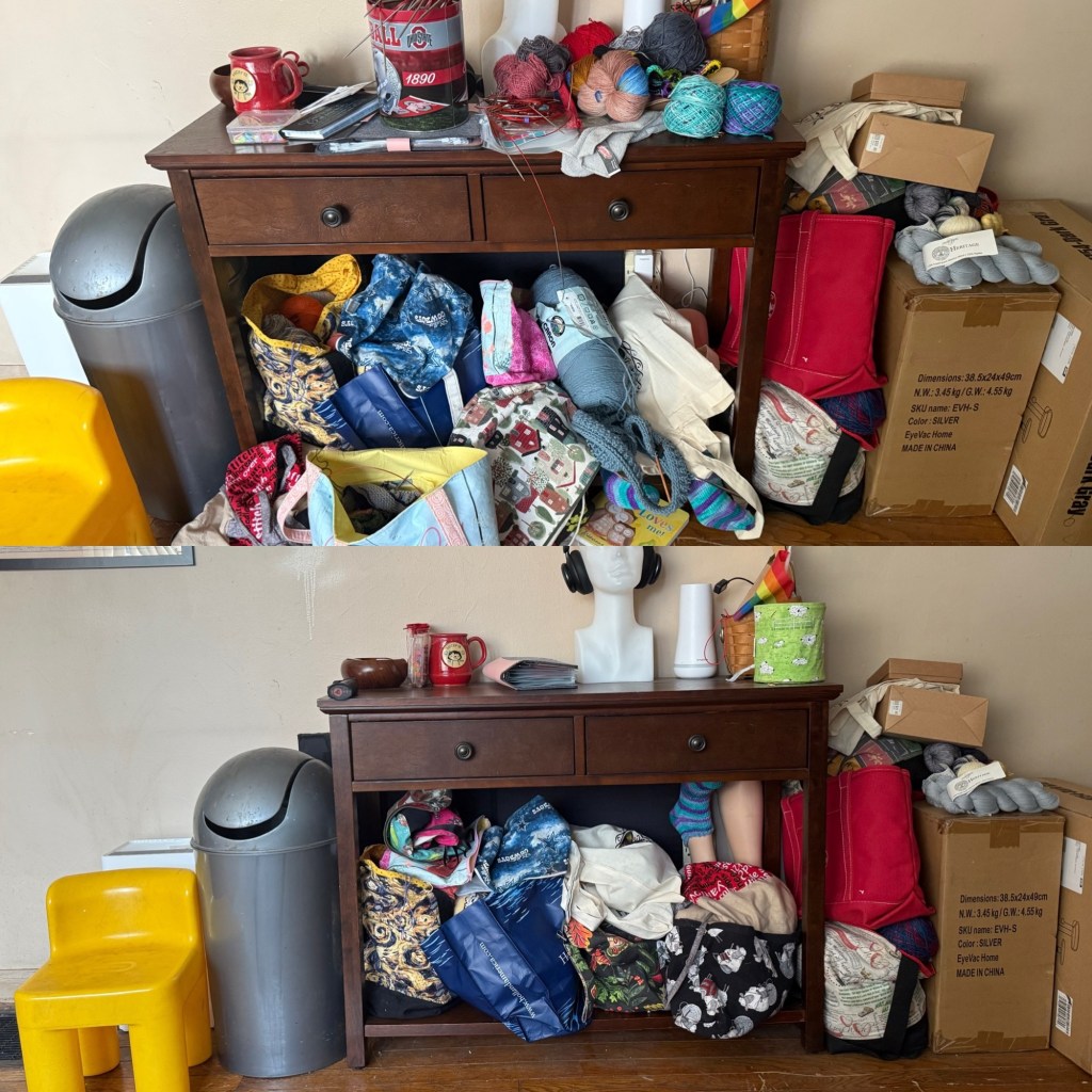 And the last space I tackled was the living room table where my WIPs-in-waiting live along with the knitting supplies I don’t need at my fingertips on the couch. I’ve donated a bunch of my older Boye and Addi circular needles, among other things, and there was a bit of trash here, too. More work to be done as with everything else, but this is so much better!