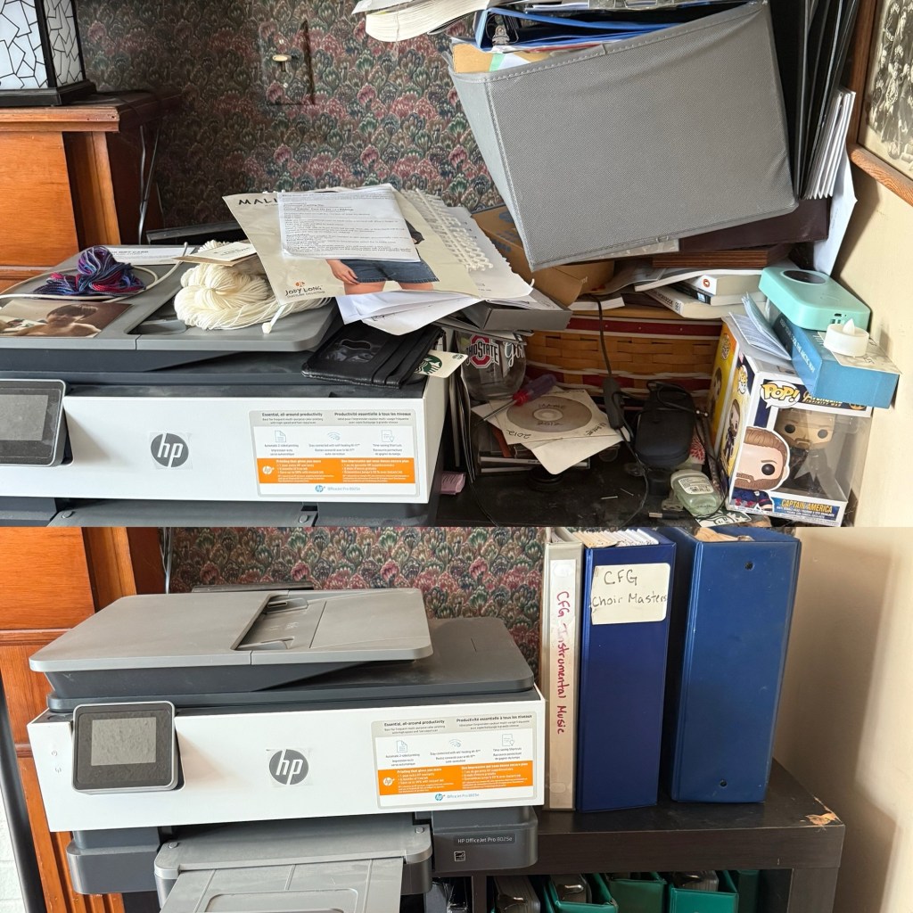 Once I got home and had a few minutes to recover from that adventure, I switched to the living room where I had two small areas to focus on. Because this space is generally decluttered already, I turned my attention to a couple key hot spots. The bookcase where my printer/scanner currently resides is also home to my primary collection of church music. The top of the unit, however, had become a dumping ground for miscellaneous stuff! I removed everything, pitching trash & recycling, which was most of it, and added to my donation box. Once the space was clear, I could put the binders of church music that are on loan temporarily as I continue as interim director for the choir.