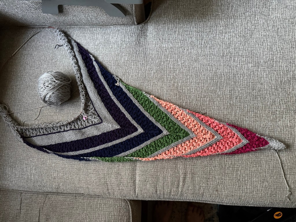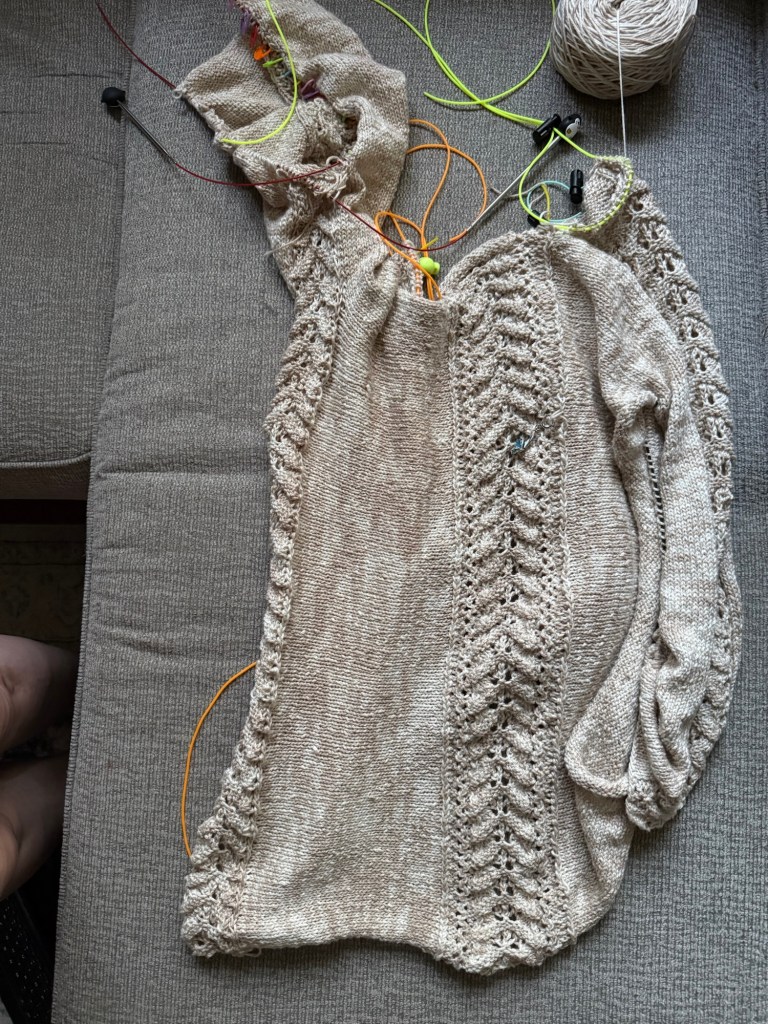 And the cardigan is moving right along, too! I finished the center back lace panel and got moving on the left side lace panel, joining front to back and then the sleeve. I did have to rip and rework the side panel early last week because I wasn’t paying attention and had twisted the front section before joining front to back. But it’s looking lovely now! I also added in the final skein on Sunday – a sign that I’m closing in on the finish line here! Once I finish joining the left sleeve, I’ll repeat the lace panel on the right side (being careful from the start not to twist it, lol) followed by the collar. By focusing on just the two projects, I should have no problem finishing this by the end of the month!