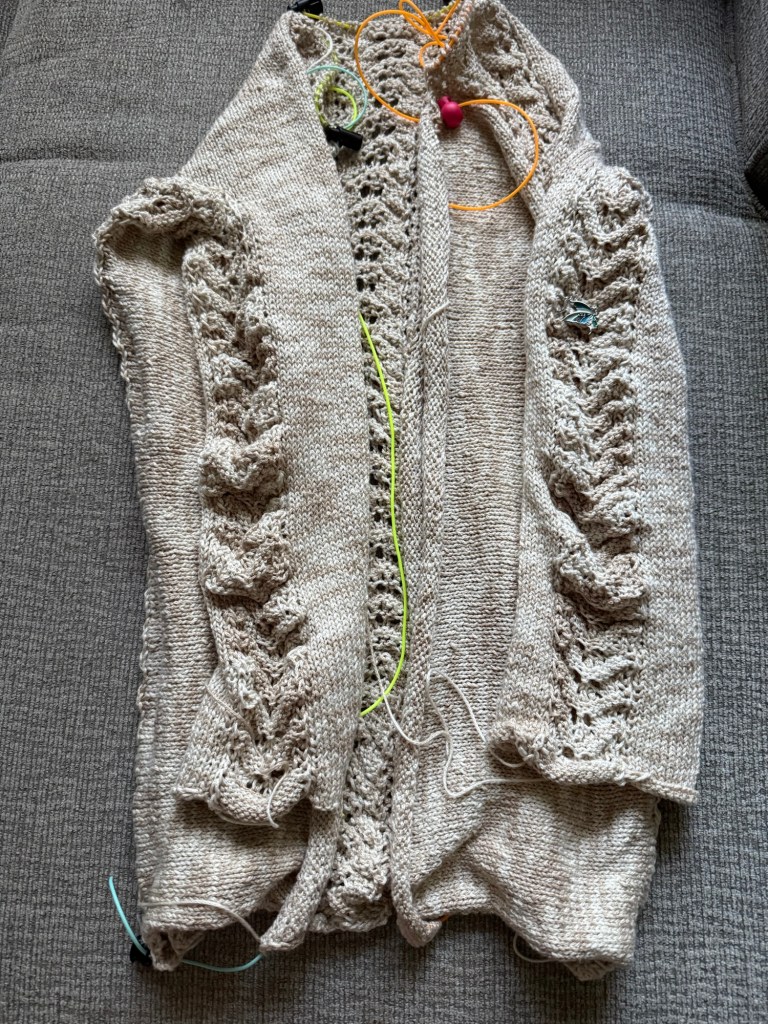 And I’m particularly excited about my progress on the cardigan! A week ago I was making my way up the left sleeve with the side lace panel. I’ve finished both the left and right side lace panels, so now I’m ready to start on the collar! I’m really looking forward to finishing and blocking this sweater as it seems to be ideal as a neutral cover at church, and it’s sure to get a lot of wear this fall. And I absolutely love how Stitch Saver has made this project so easy! I’ve only had to pick up stitches in certain spots where the held stitches weren’t enough to span the edge nicely.