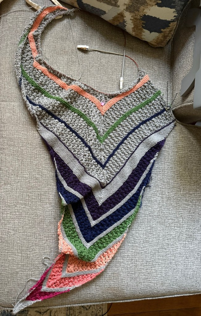 August keeps marching on, and I’ve continued to be faithful to my two key projects. The Camp Loopy shawl is growing longer, though its width has hit its max. The purple and blue lace sections are slightly better lit here, though they’re so close in saturation value, you might not be able to tell the difference. I like that the garter stitch sections between MC lace sections now grow with each color. And because it’s an easy pattern to move along, I’m ahead of schedule – started Monday with 70% complete by stitch count.