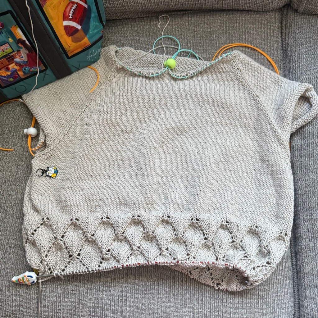 The summer sweater I started for the Pigskin Party is working up nicely. I’ve modified the design by lengthening it – partly because I like longer tops, and partly because I want to use at least 1,000 yards of yarn to earn bonus points, lol.