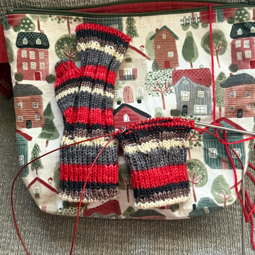 I did start a couple new projects though, after completing the pouch. First, I cast on a pair of fingerless mitts in DK weight yarn. The yarn dyer and pattern designer are Pigskin Party sponsors, making it an easy choice, especially since it’s a pretty quick knit! I worked up the first mitt in about three days. The tubular cast on is easy-peasy using Stitch Saver!