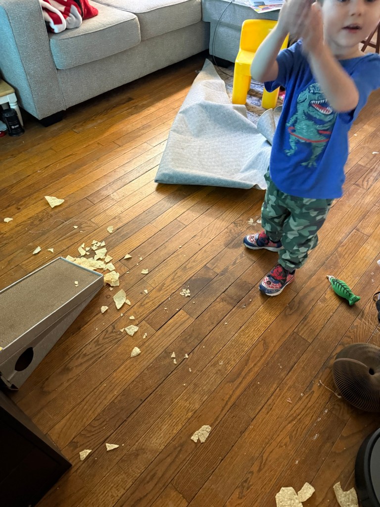 Not shown: Many more tortilla chips inside the “rug taco” – easy enough to sweep up the chips and restore the rug… but that was a big bag of chips he dumped out!