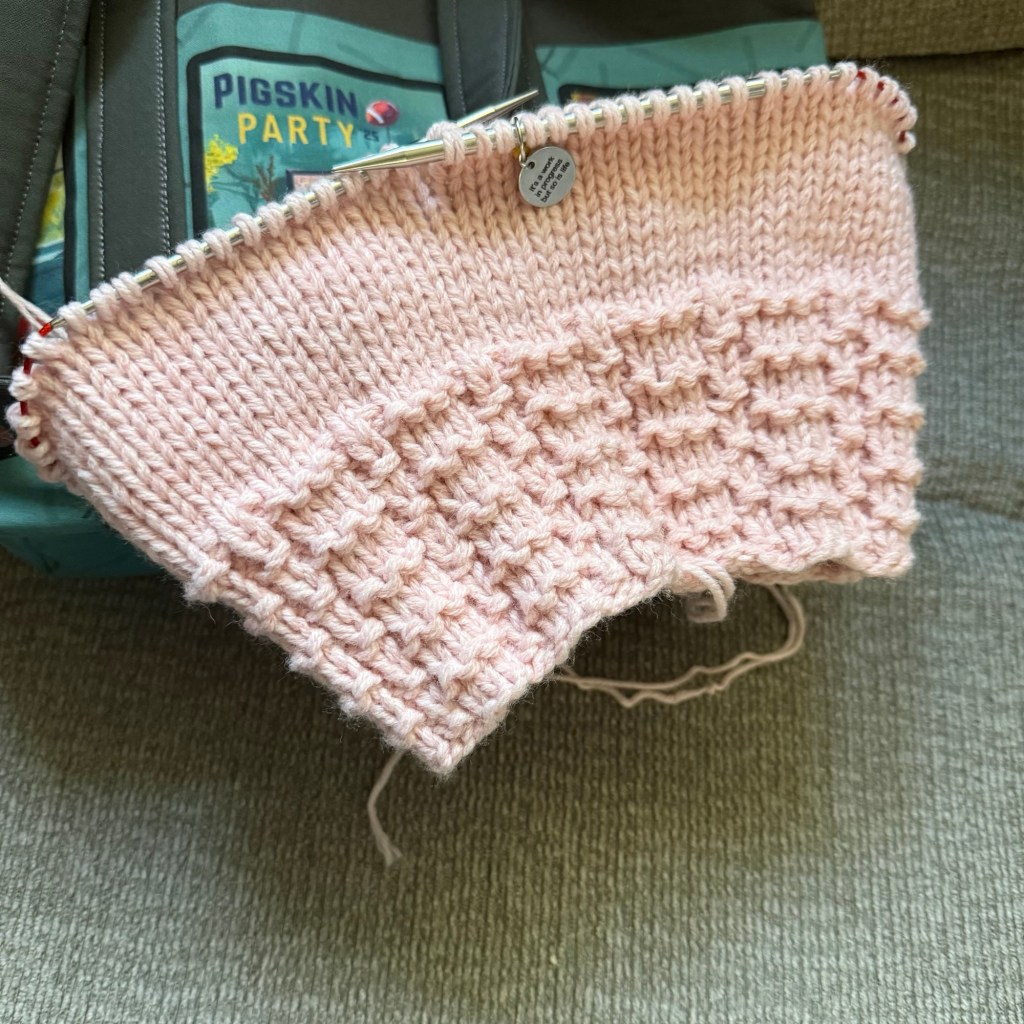 And because October is rapidly coming to a close, I had to make time for a pink project to knit for the Down Cellar Studio Pigskin Party’s challenge. Because this challenge has a 200-yard minimum, I opted for something that would allow me to double-up on yardage. This hat pattern is designed for worsted weight yarn, and I found some pink stash in a sport weight. I’m in good shape to finish by EOD on Friday.