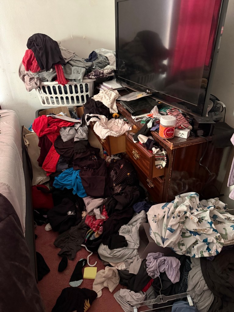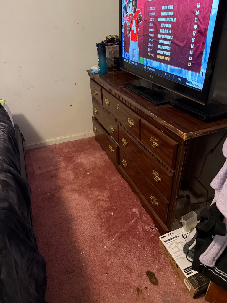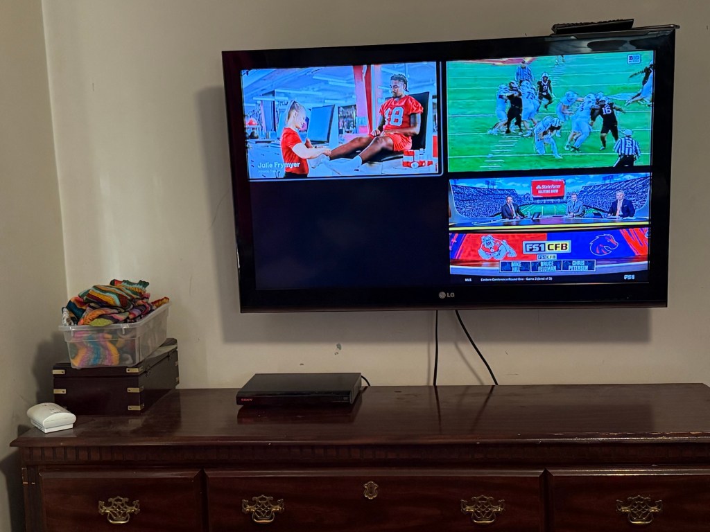 Once I’d completed the task of clearing all that space, removing trash and recycling and setting aside laundry to handle, I started on my big task of the day, something of a reward for that decluttering effort: I installed a wall mount and hung the TV on it, by myself. I was a little nervous about the last step, but I have a decent understanding of handling heavy objects, and I’ve got some strength in me. (I’m 99% sure my mother would not have been able to do this when she was my age, which honestly makes me feel even prouder.)