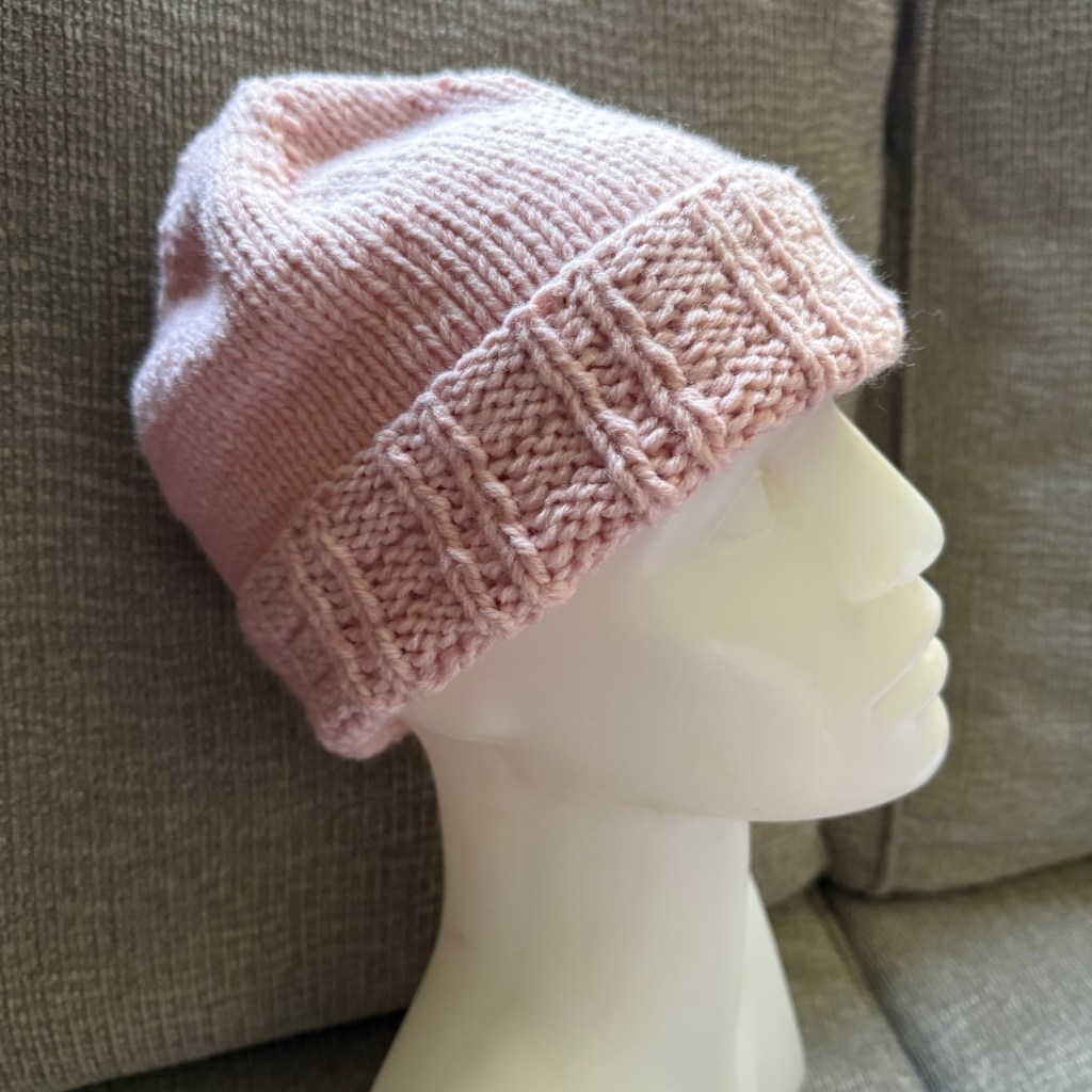 I managed a couple FOs last week, a nice change from last week! First, I finished the hat that I’d cast on the week before. This will be donated to a charity collection of winter weather wear in the Boston area, and I knit it in a pink yarn to qualify for bonus points in the Down Cellar Studio Pigskin Party (PSP)!