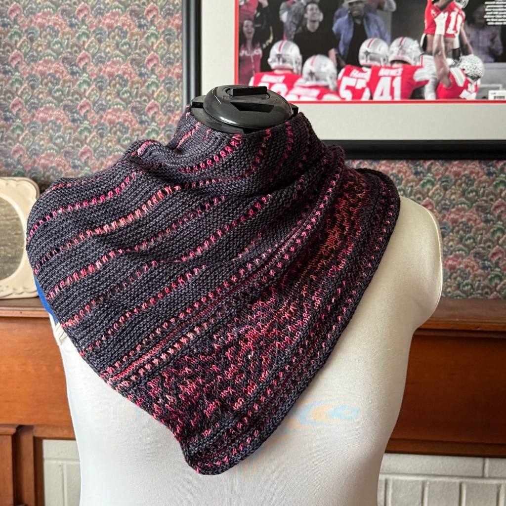 Then I shifted back to the two-color cowl that used yarn I bought at Zombie Knitpocalypse this past summer. I finished the mosaic section which was followed by some easy garter stitch and stockinette, followed by an i-cord bind-off. Once I blocked the piece flat, I picked up stitches along one side and grafted those stitches to the provisional ones I’d cast on using stitch saver. If I’d paid closer attention, I could have avoided having to pick up stitches; but it wasn’t a big imposition.